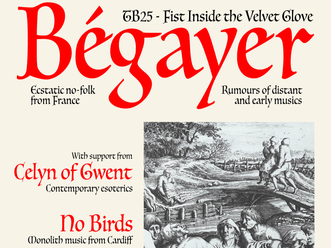 tB, in collaboration with Sgarab tapes, are thrilled to announce that French quintet Bégayer will headline a night of celebrations as part of TB25: Fist Inside the Velvet Glove. One of the most extraordinary live acts in Europe today, Bégayer are a perfect distillation of the daring, interdisciplinary work which tB have always sought to bring to Wales. Support from Celyn of Gwent and No Birds